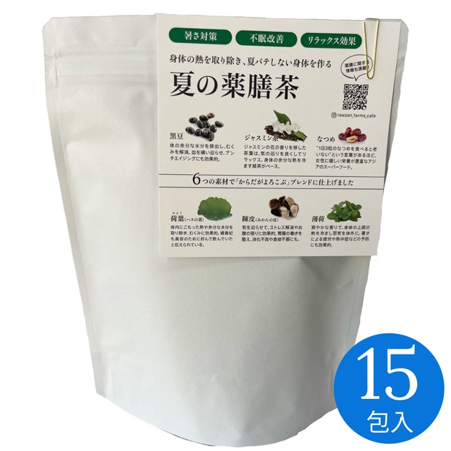 《オンライン限定》2週間分のティーバッグ15包が入ったお得なセット。毎日の美容と健康づくりのサポートに、まずは2週間お試しください! ------------------------------------------------ 大変ご好評いただいている梅雨の薬膳茶が、薬膳茶「巡」MEGURASHIとして登場! 身体の余分な水分や湿を取り除いて、気を巡らせるブレンド。 雨の日に体調を崩しやすい方や、むくみ、身体のだる重さが気になる方におすすめです。 はと麦、小豆、黒豆、南蛮毛(とうもろこしのヒゲ)などを合わせ、身体の水捌けを良くして消化吸収の働きを助けます。 ほんのり金木犀が香る、甘く香ばしいすっきりとした味わいです。 ノンカフェインなので、お好きなシーンでお愉しみいただけます。 身体を温めリラックスして、毎日を健やかに心地よくお過ごしください! \こんな方におすすめ/ ✔︎雨の日に体調を崩しやすい ✔︎むくみが気になる ✔︎身体がだる重い ✔︎頭が重たく張って痛くなりやすい