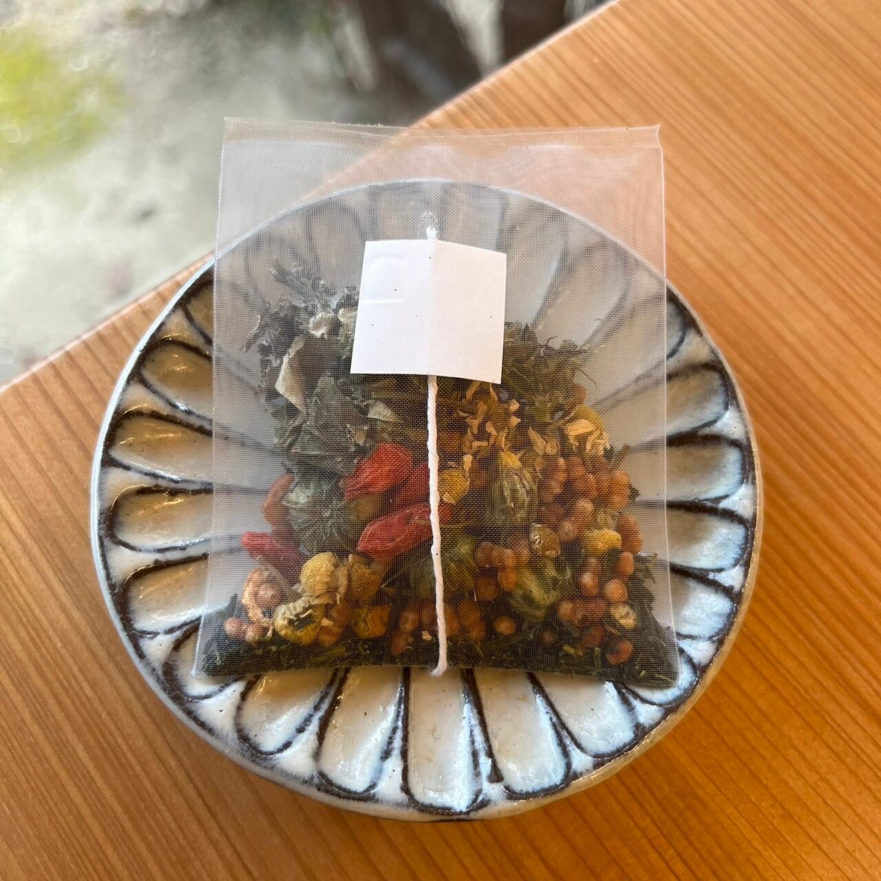 【原材料名】 玄米茶(国産)、菊花、よもぎ、クコの実、カモミール、陳皮